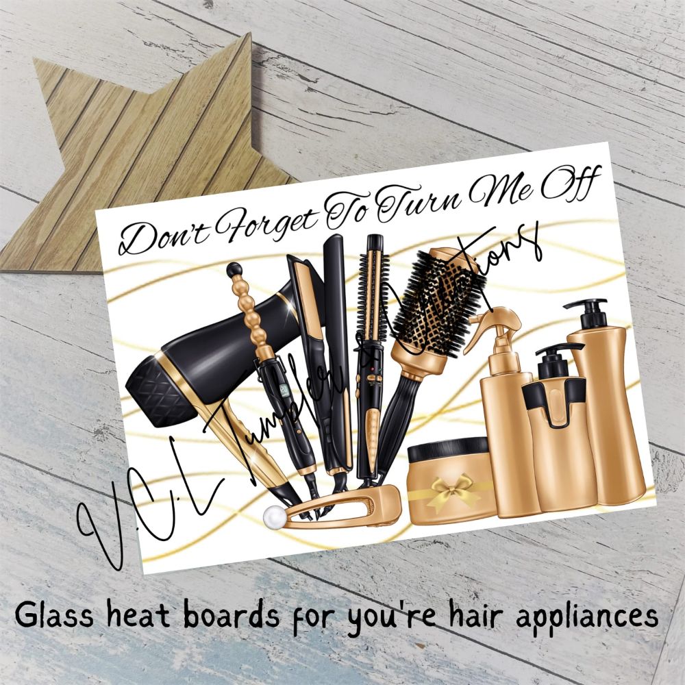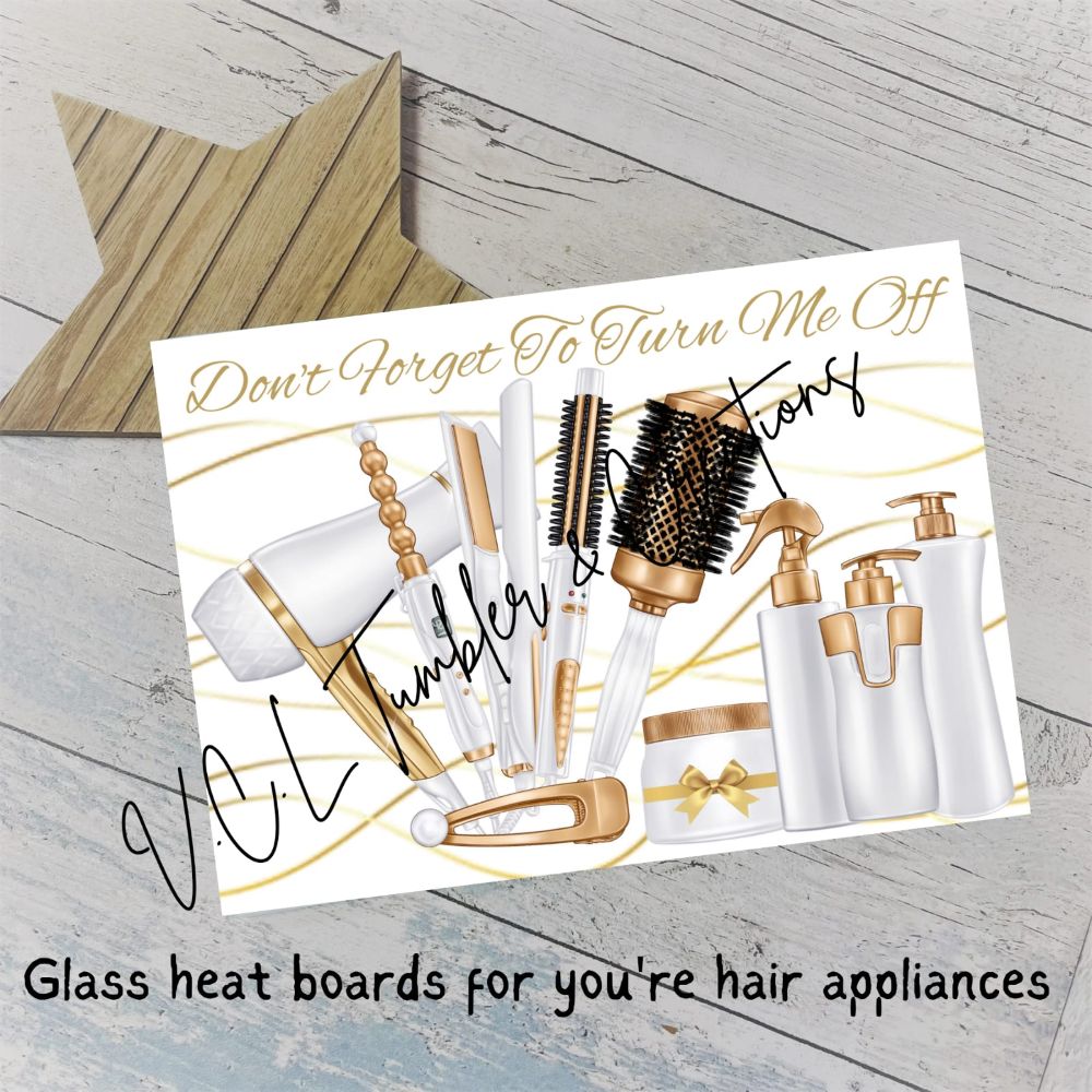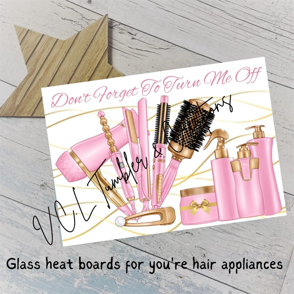 Hear we have our newest product our stunning A4 glass heat resistant cosmetics boards, with 3 high quality stunning designs to choose from. they come complete with your personalised name or your business name for that extra special touch, Full of vibrant colours these are visually stunning whether in you bedroom or in your salon. Due to been heat resistant these are the perfect solution to store your crimpers, curling tongs or any heated cosmetic appliance on with out the worry of burning your dressing table, draws etc. Made of high quality clear heat resistant glass and printed using high quality ink for bright ,vibrant stand out colours, complete with 4 rubber feet to prevent the board from slipping on the side.