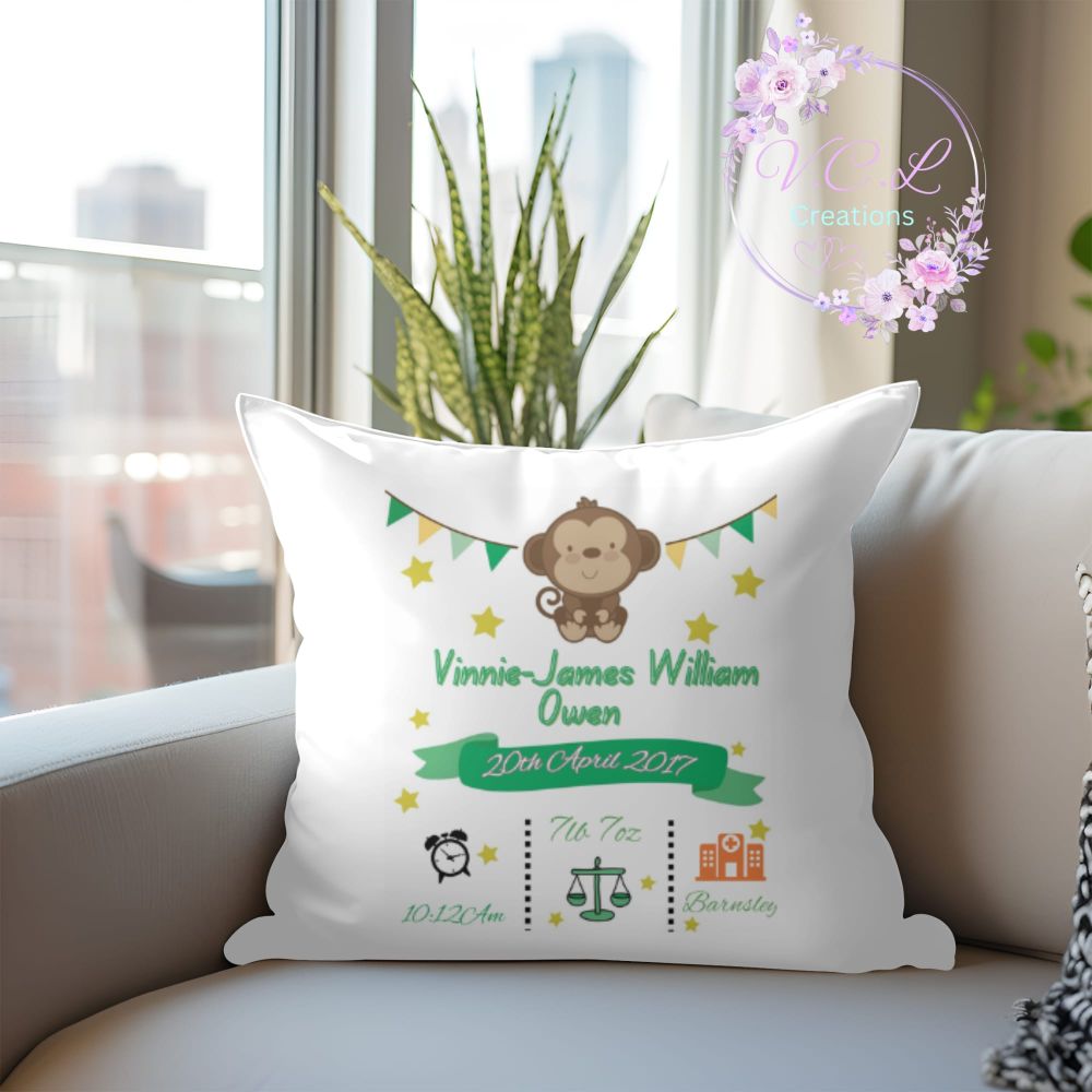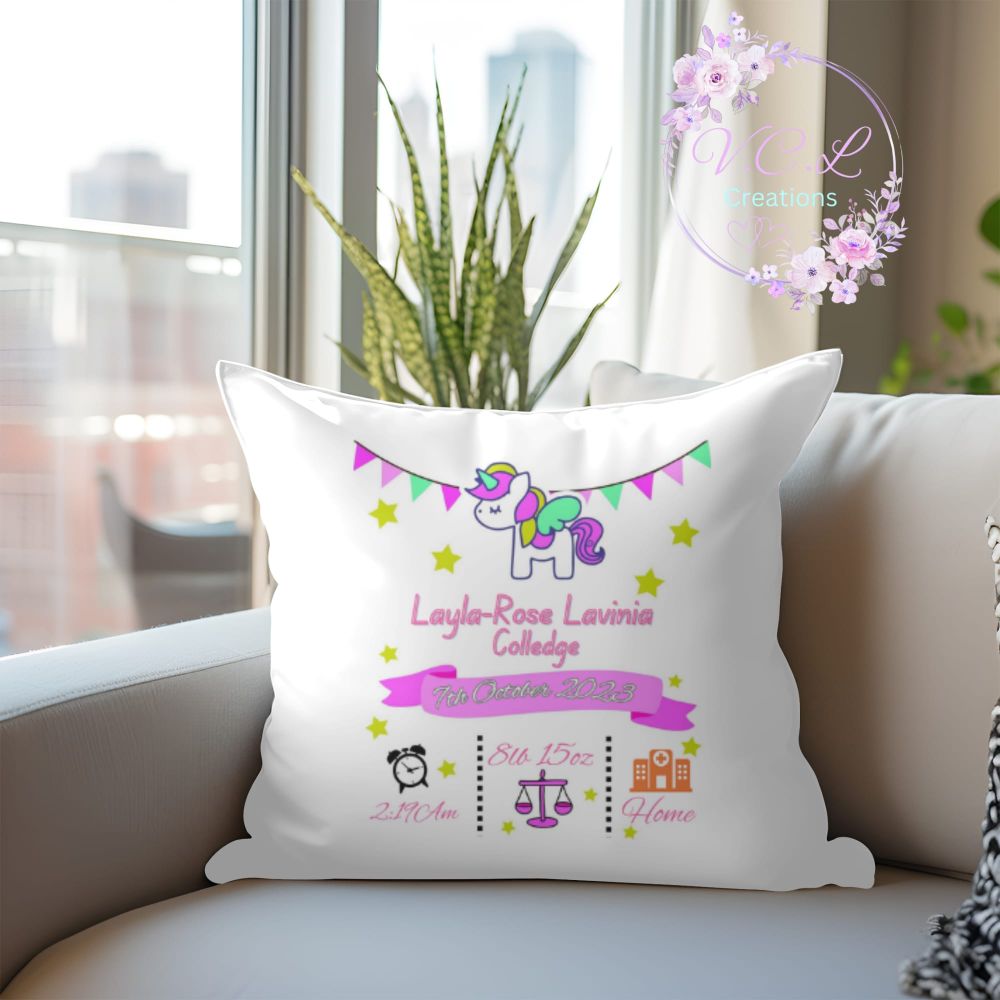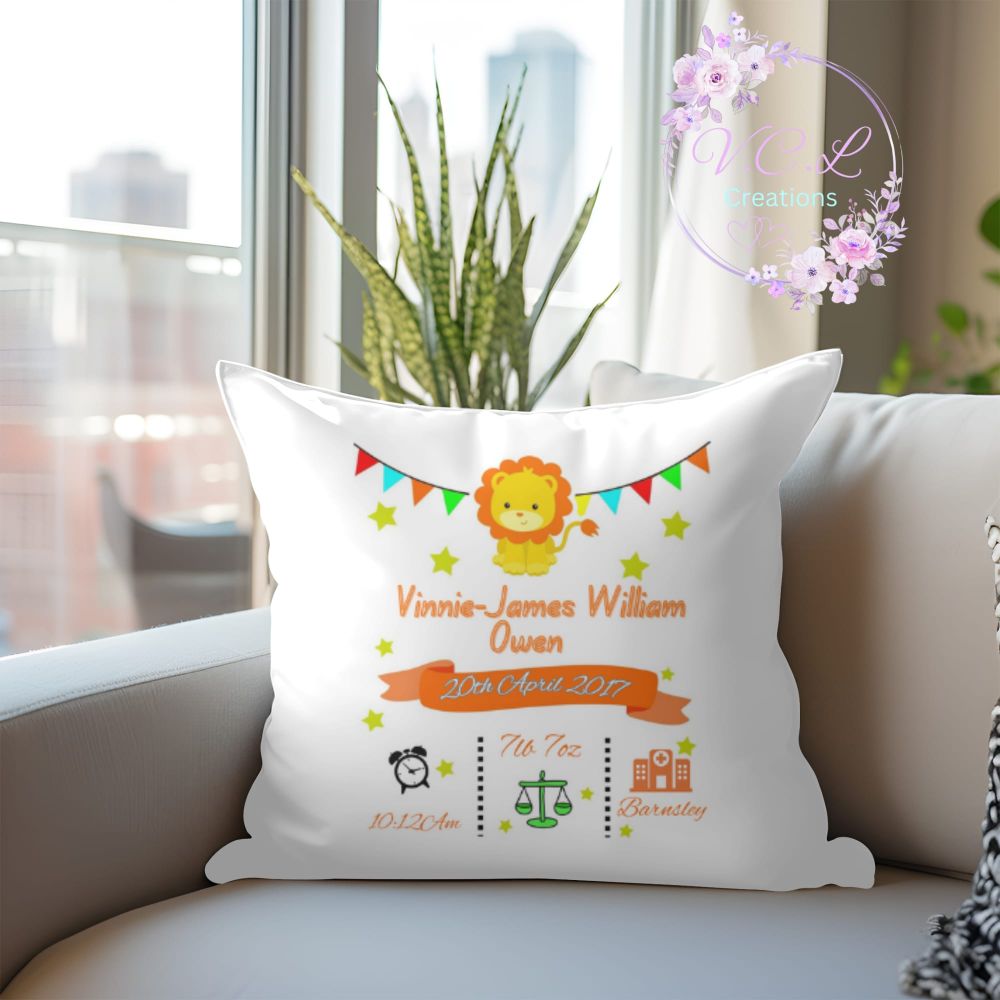 This stunning customisable 40cm by 40cm soft birth announcement cushion including insert, uniquely designed by our in house design expert you can add your personalised name along with customisable personal deatails such as time and date.. With four colours to chose from for both boys and girls, Printed using high quality ink onto a soft feeling 100 percent polyester cushion cover bringing that finishing touch to any football fanatics living area. Complete with a soft fluffy insert for comfort. Contact our design expert to bring your design to life.