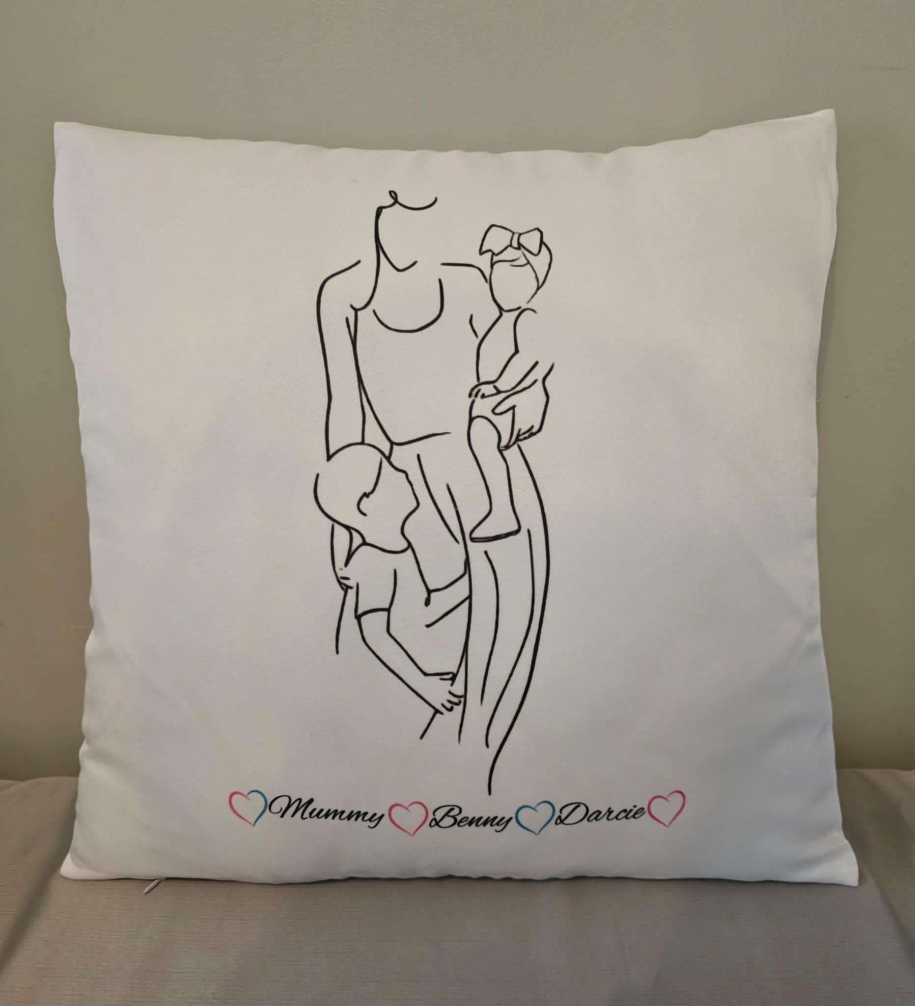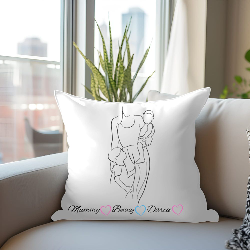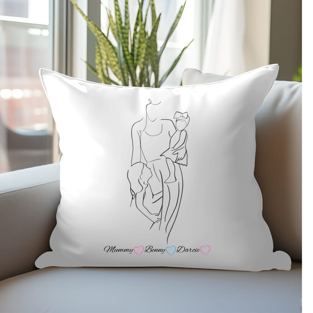 Our elegantly designed mum with her two children inspired cushion cover, is customisable with mums name and both children’s names.