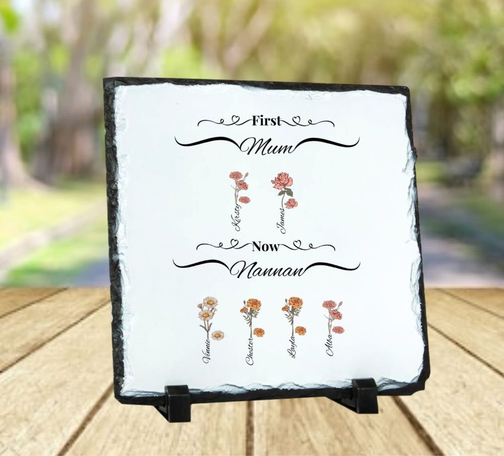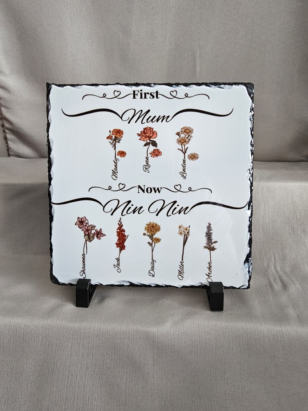 Family 19cm x 19cm photo slate, fully customisable with how ever many relatives name u require and the amount of flowers to match, complete with 2 feet stands to display.