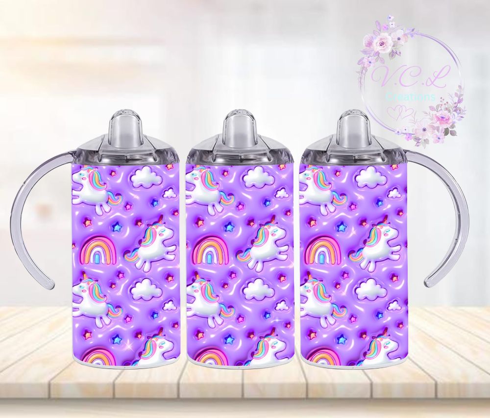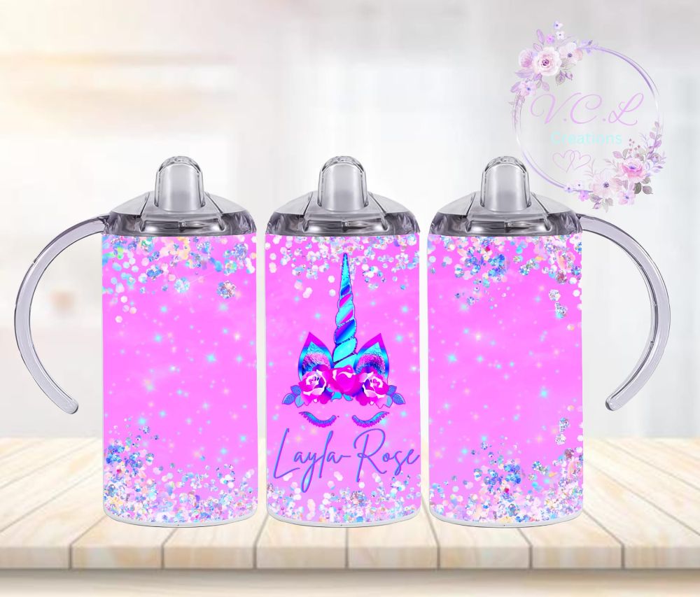 Girls unicorn 12oz vacuum insulate sippy cup perfect for little ones of all ages, with 4 different designs to choose from, comes complete with 2 screw on lids 1 leak proof sippy lid with training handles and 1 slide sip lid with straw both lids are screw on lids to prevent spills. The double wall design along with vacuum insulated is perfect for keeping their beverage of choice at the optimised temperature for 6 to 12 hours, whether it be a nice cold glass of juice or a nice warming hot chocolate on a cold night. With two beautiful designs to choose from these sippy cups are the perfect addition to any little ones drinkware collection. Some designs have the extra special option of having personalised name printed on.