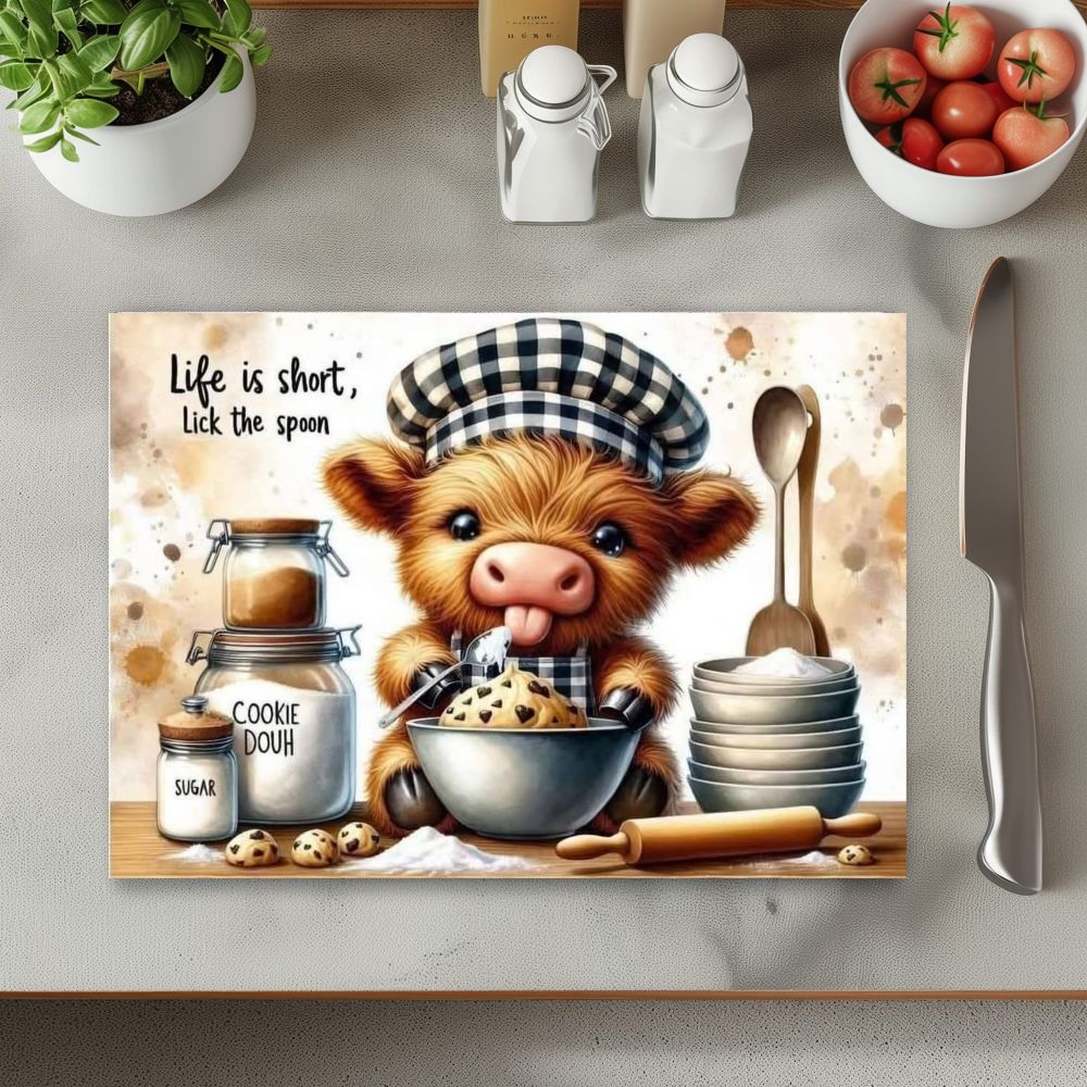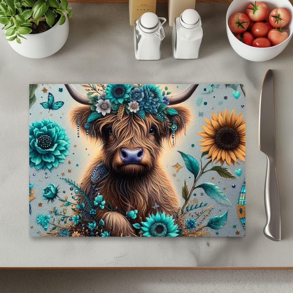 beautiful highland cow inspired a4 glass chopping board, two stunning designs to choose from, designed in stunning high colour. Made from crystal clear glass and sublimated using high quality in for the bright vibrant stand out colours. This chopping board will stand out stunningly in any kitchen, along with been heat resistant their is also 4 rubber feet provided to prevent slipping on the surfaces. Usable as a chopping board in the kitchen, place mat on the table or simply a beautiful decorative feature.