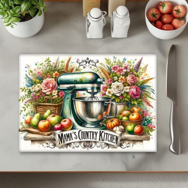 mamas country kitchena4 glass chopping board, beautiful designed in stunning high colour. Made from crystal clear glass and sublimated using high quality in for the bright vibrant stand out colours. This chopping board will stand out stunningly in any kitchen, along with been heat resistant their is also 4 rubber feet provided to prevent slipping on the surfaces. Usable as a chopping board in the kitchen, place mat on the table or simply a beautiful decorative feature.