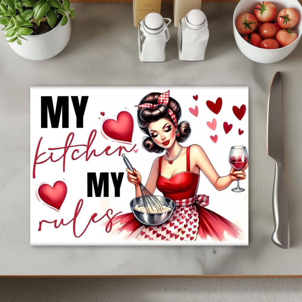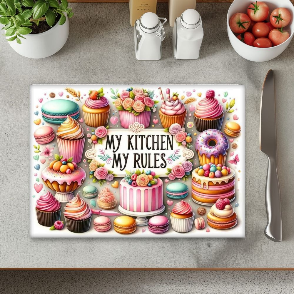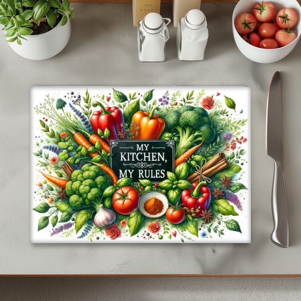 My kitchen my rules a4 glass chopping board, beautiful with 3 stunning designs to choose from, designed in stunning high colour. Made from crystal clear glass and sublimated using high quality in for the bright vibrant stand out colours. This chopping board will stand out stunningly in any kitchen, along with been heat resistant their is also 4 rubber feet provided to prevent slipping on the surfaces. Usable as a chopping board in the kitchen, place mat on the table or simply a beautiful decorative feature.