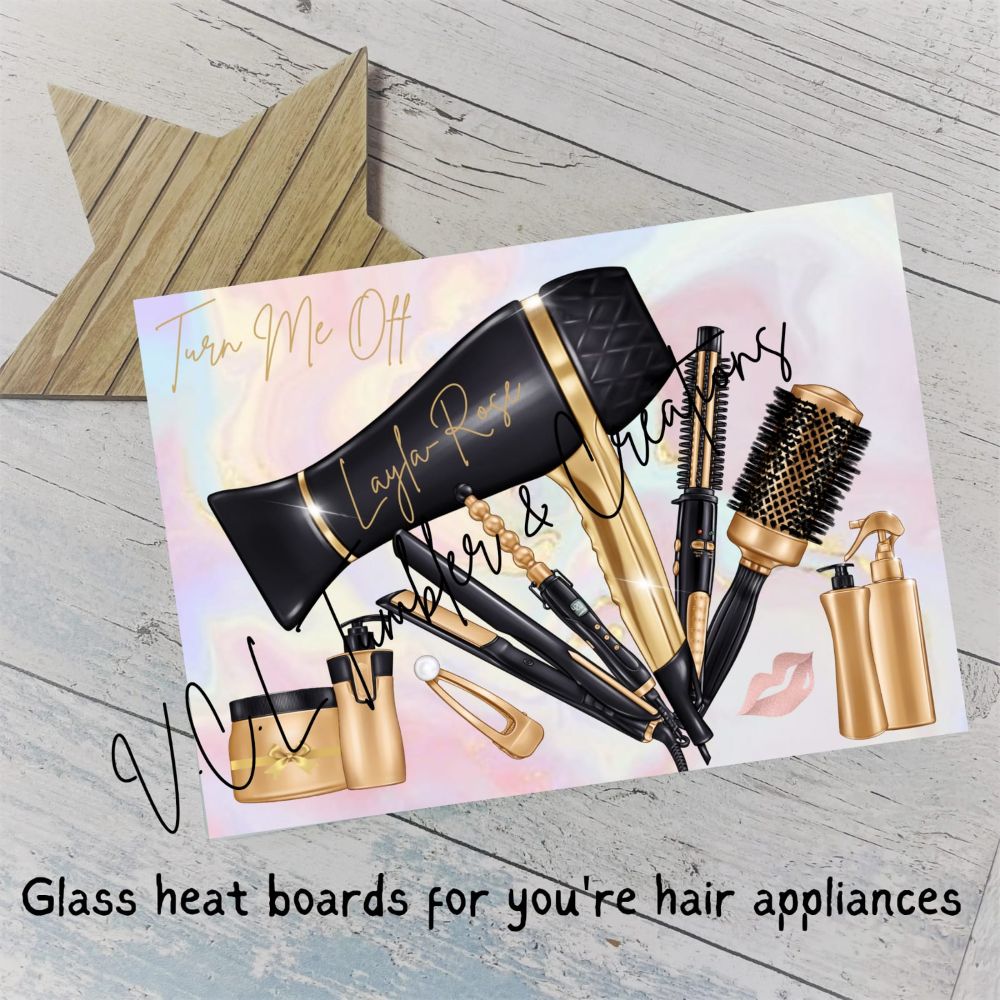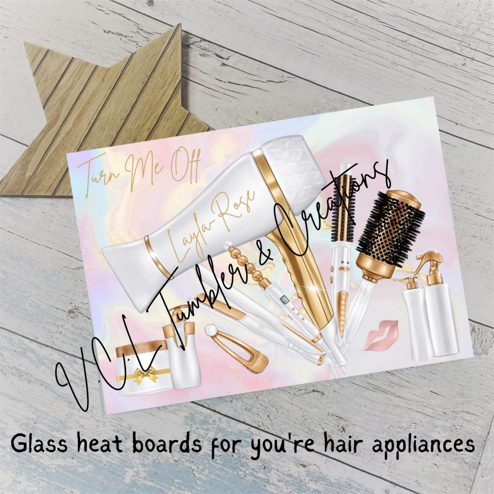Hear we have our newest product our stunning A4 glass heat resistant cosmetics boards, with 3 high quality stunning designs to choose from. they come complete with your personalised name or your business name for that extra special touch, Full of vibrant colours these are visually stunning whether in you bedroom or in your salon. Due to been heat resistant these are the perfect solution to store your crimpers, curling tongs or any heated cosmetic appliance on with out the worry of burning your dressing table, draws etc. Made of high quality clear heat resistant glass and printed using high quality ink for bright ,vibrant stand out colours, complete with 4 rubber feet to prevent the board from slipping on the side.