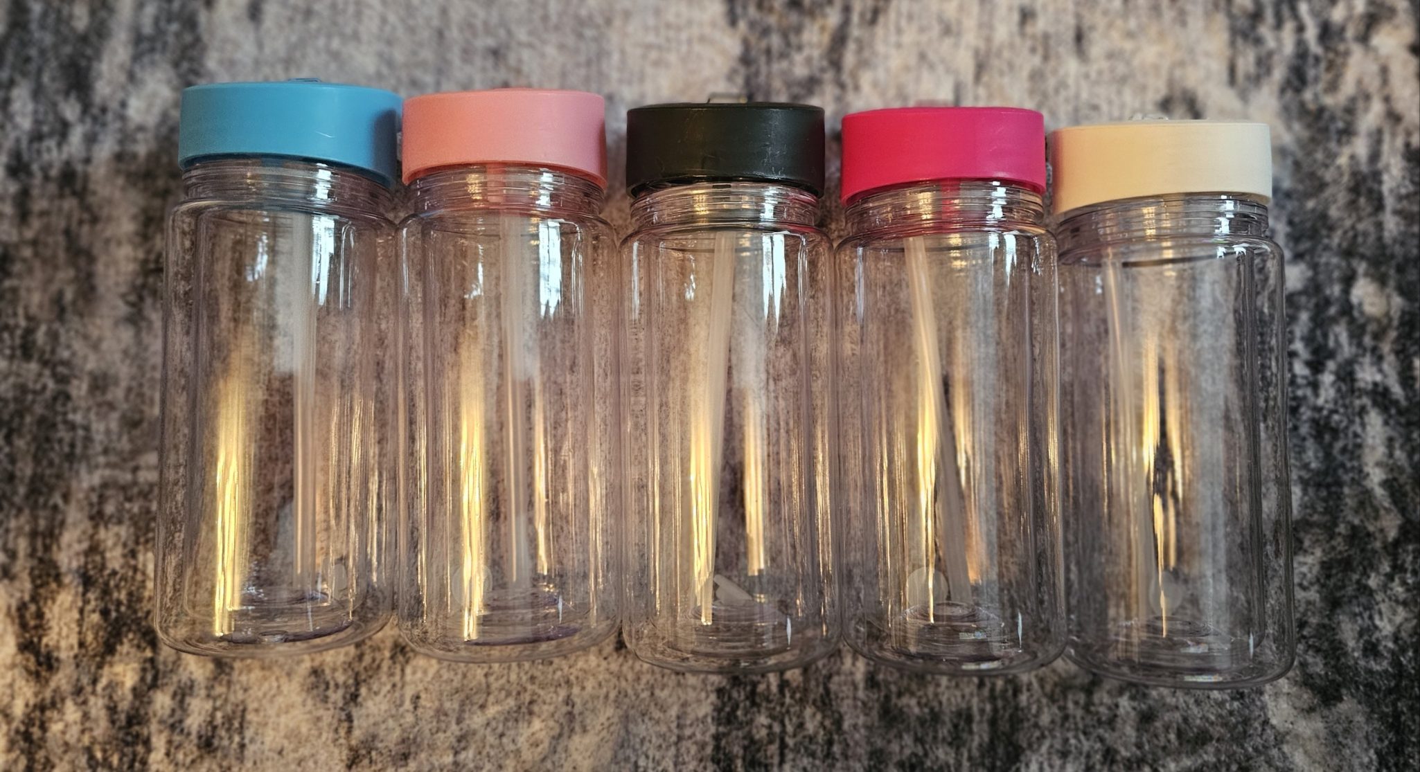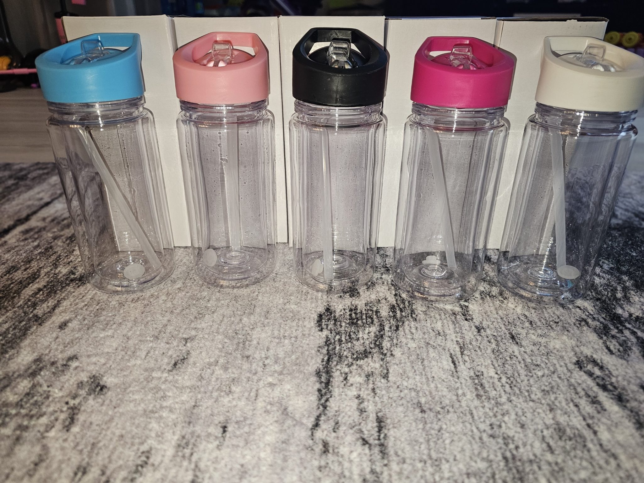 we now have your 10oz snowglobe waterbottles. each water bottle is pre drilled and come with stopper. There is 5 colours to choose from, light pink, dark pink, blue, white and black.